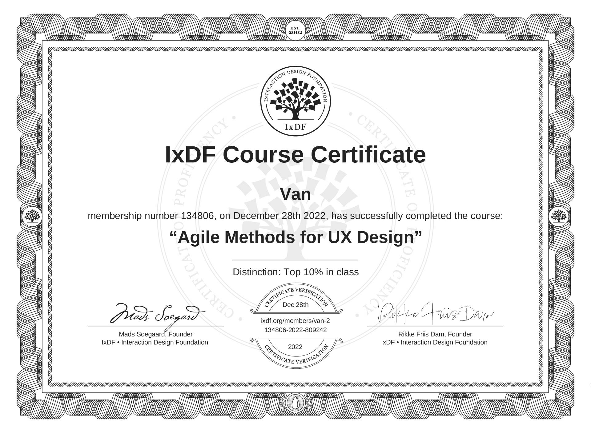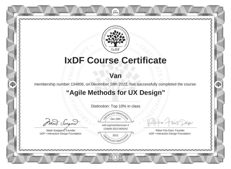 The IxDF Course Certificate above is awarded to Van with a Top 10% Distinction in formal recognition of their coursework surpassing the rigorous benchmarks of exceptional performance established by the IxDF Educational Codex.