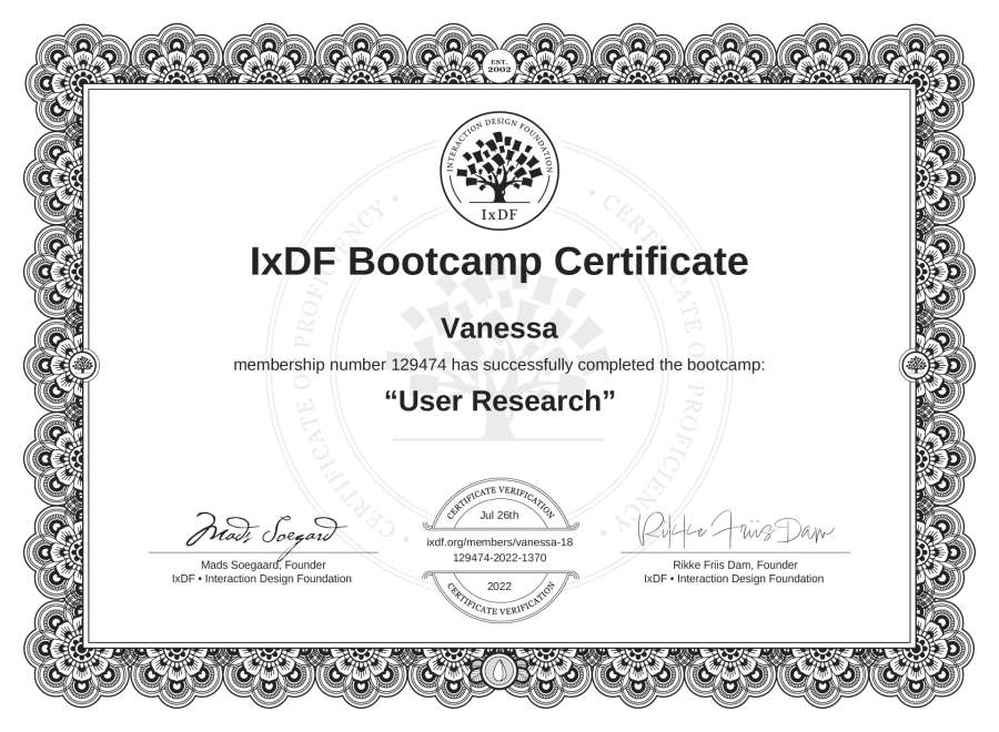 The Bootcamp Certificate below verifies that Vanessa has completed the bootcamp User Research .