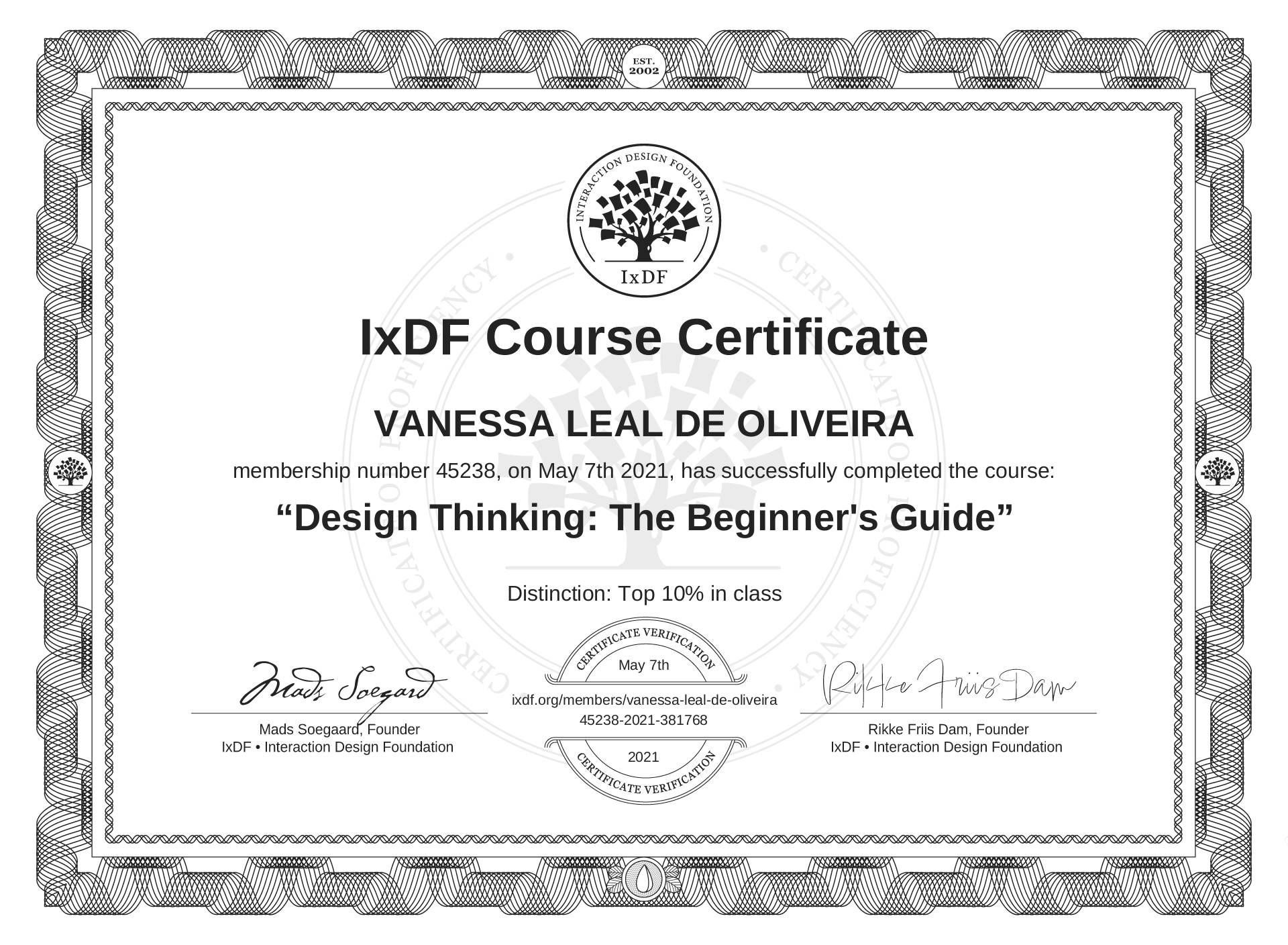 The IxDF Course Certificate above is awarded to VANESSA LEAL DE OLIVEIRA with a Top 10% Distinction in formal recognition of their coursework surpassing the rigorous benchmarks of exceptional performance established by the IxDF Educational Codex.