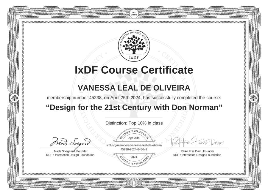 VANESSA LEAL DE OLIVEIRA's IxDF Course Certificate: Design for the 21st Century with Don Norman