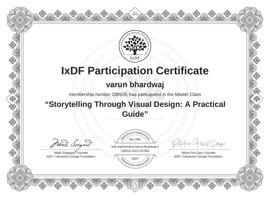 varun bhardwaj's IxDF Masterclass Certificate: Storytelling Through Visual Design: A Practical Guide