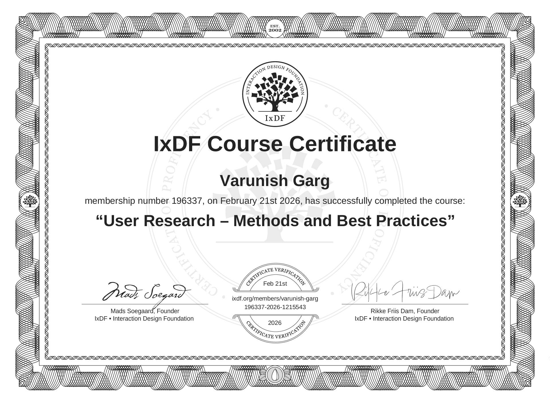 The IxDF Course Certificate above is awarded to Varunish Garg in formal recognition of their coursework surpassing the rigorous benchmarks of exceptional performance established by the IxDF Educational Codex.