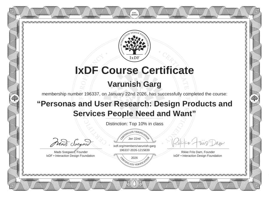 Varunish Garg's IxDF Course Certificate: Personas and User Research: Design Products and Services People Need and Want