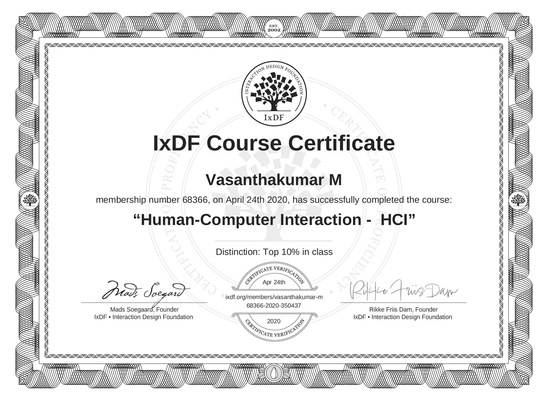 The IxDF Course Certificate above is awarded to Vasanthakumar M with a Top 10% Distinction in formal recognition of their coursework surpassing the rigorous benchmarks of exceptional performance established by the IxDF Educational Codex.