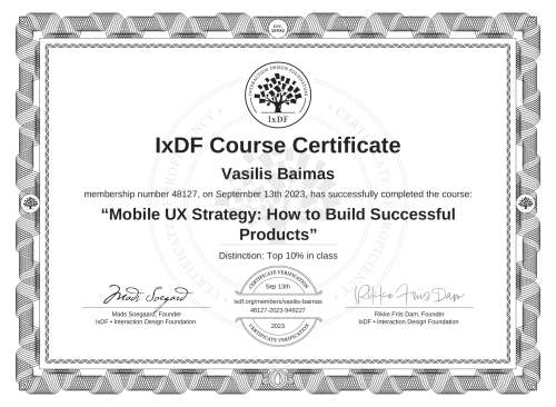 IxDF Course Certificates are awarded to Vasilis Baimas in formal recognition of their coursework surpassing the rigorous benchmarks of exceptional performance established by the IxDF Educational Codex.