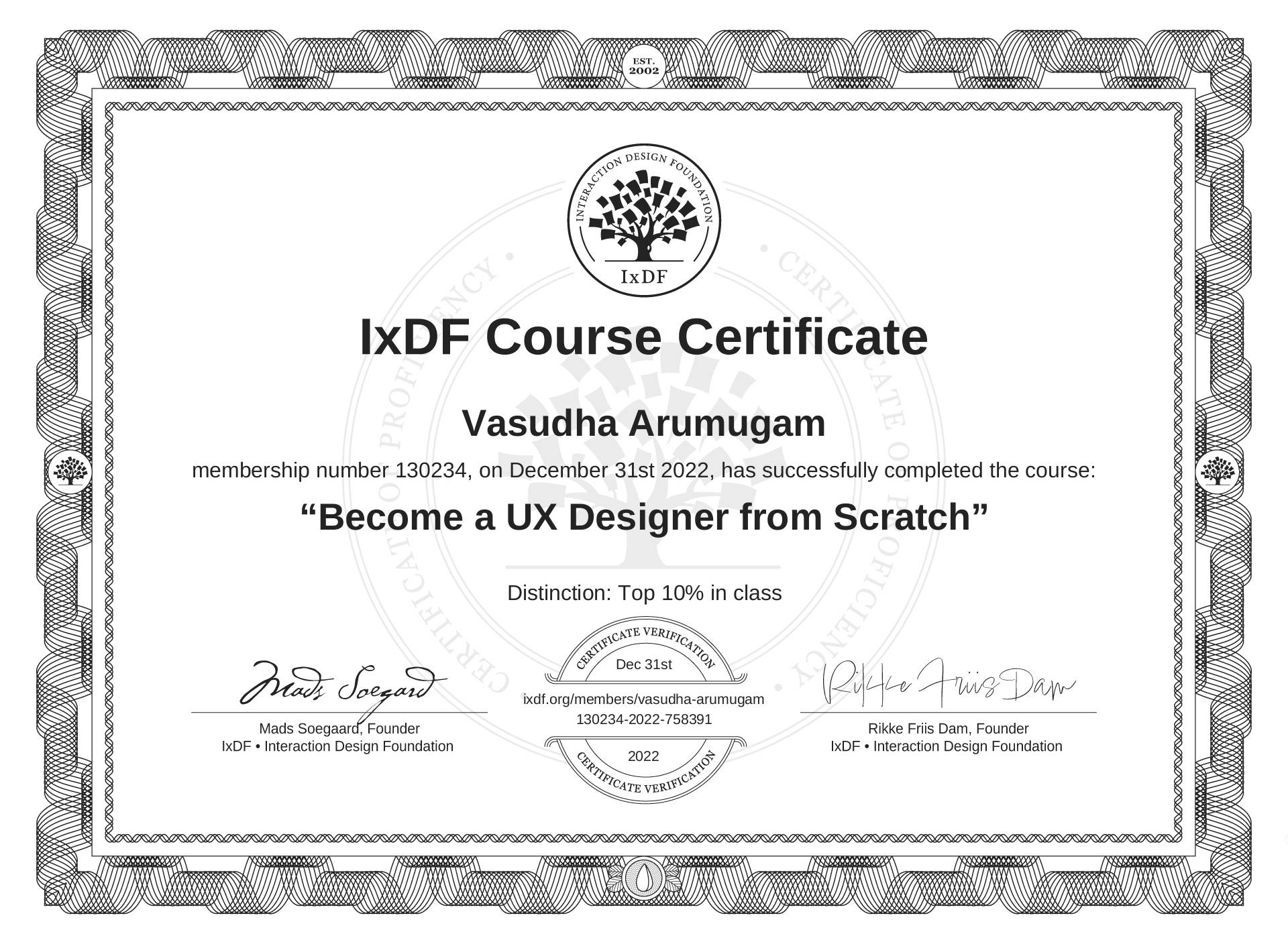 The IxDF Course Certificate above is awarded to Vasudha Arumugam with a Top 10% Distinction in formal recognition of their coursework surpassing the rigorous benchmarks of exceptional performance established by the IxDF Educational Codex.