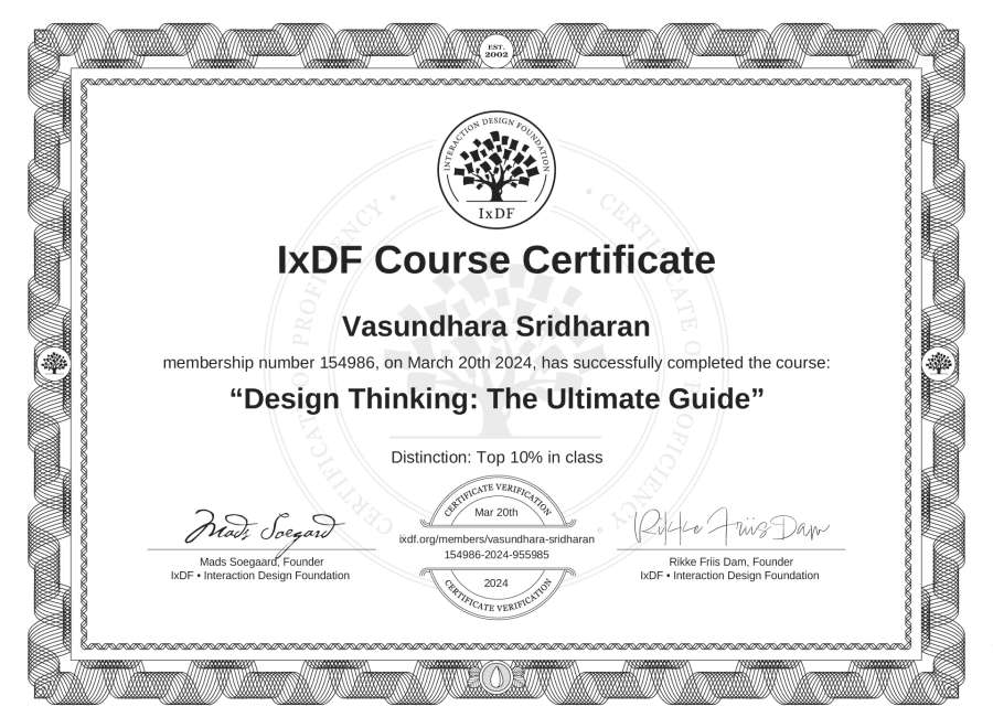 The IxDF Course Certificate above is awarded to Vasundhara Sridharan with a Top 10% Distinction in formal recognition of their coursework surpassing the rigorous benchmarks of exceptional performance established by the IxDF Educational Codex.