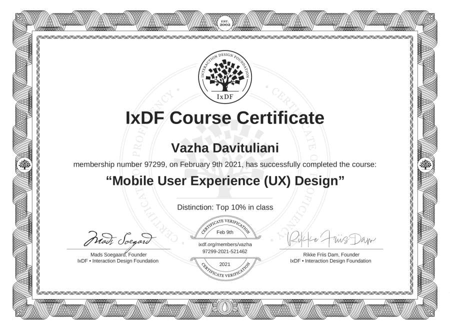 The IxDF Course Certificate above is awarded to Vazha Davituliani with a Top 10% Distinction in formal recognition of their coursework surpassing the rigorous benchmarks of exceptional performance established by the IxDF Educational Codex.