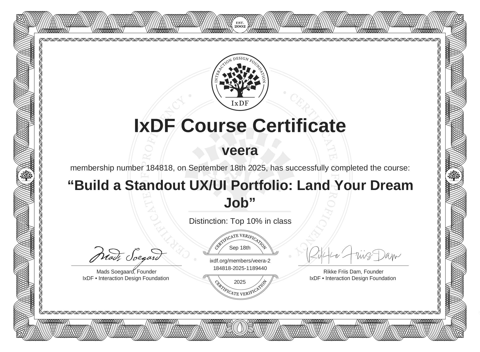 The IxDF Course Certificate above is awarded to veera with a Top 10% Distinction in formal recognition of their coursework surpassing the rigorous benchmarks of exceptional performance established by the IxDF Educational Codex.