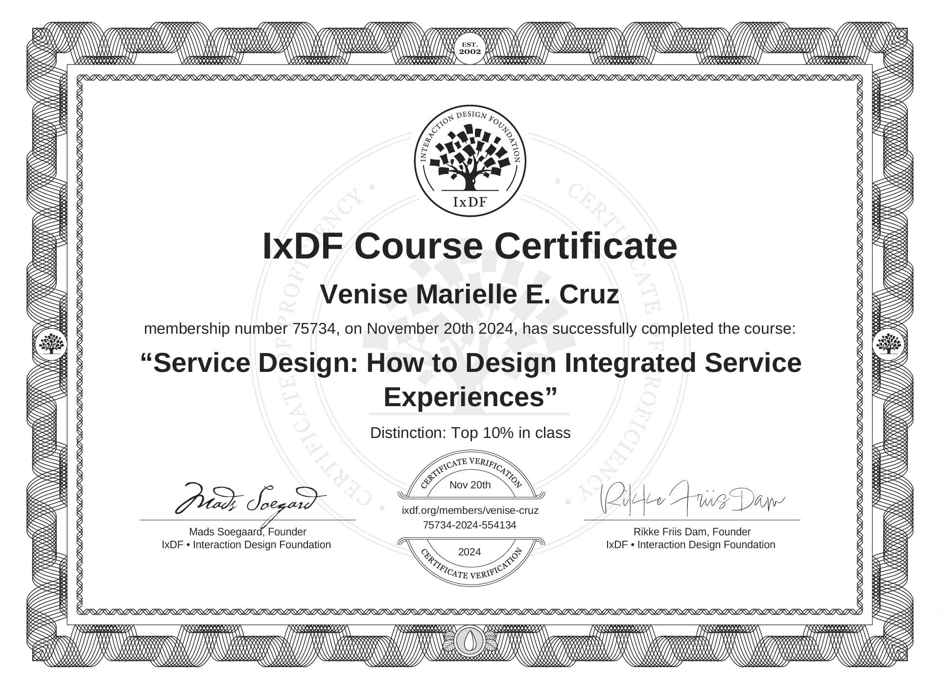 The IxDF Course Certificate above is awarded to Venise Marielle E. Cruz with a Top 10% Distinction in formal recognition of their coursework surpassing the rigorous benchmarks of exceptional performance established by the IxDF Educational Codex.