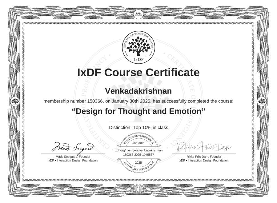 Venkadakrishnan's IxDF Course Certificate: Design for Thought and Emotion