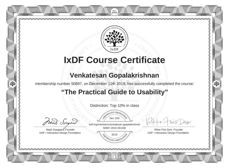 Venkatesan Gopalakrishnan's IxDF Course Certificate: The Practical Guide to Usability