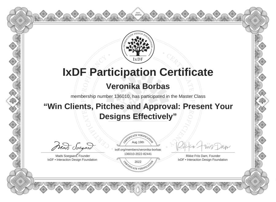 Veronika Borbas's IxDF Masterclass Certificate: Win Clients, Pitches and Approval: Present Your Designs Effectively