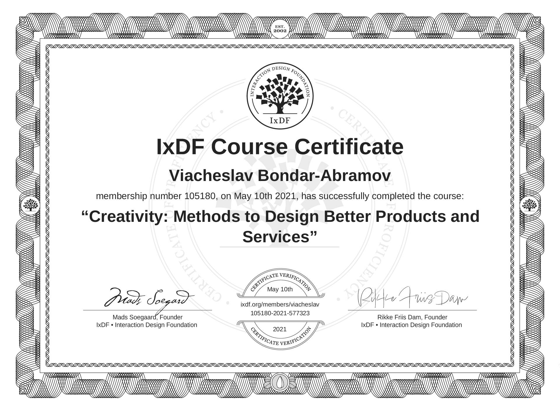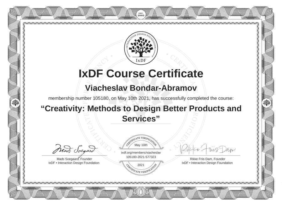 Viacheslav Bondar–Abramov's IxDF Course Certificate: Creativity: Methods to Design Better Products and Services