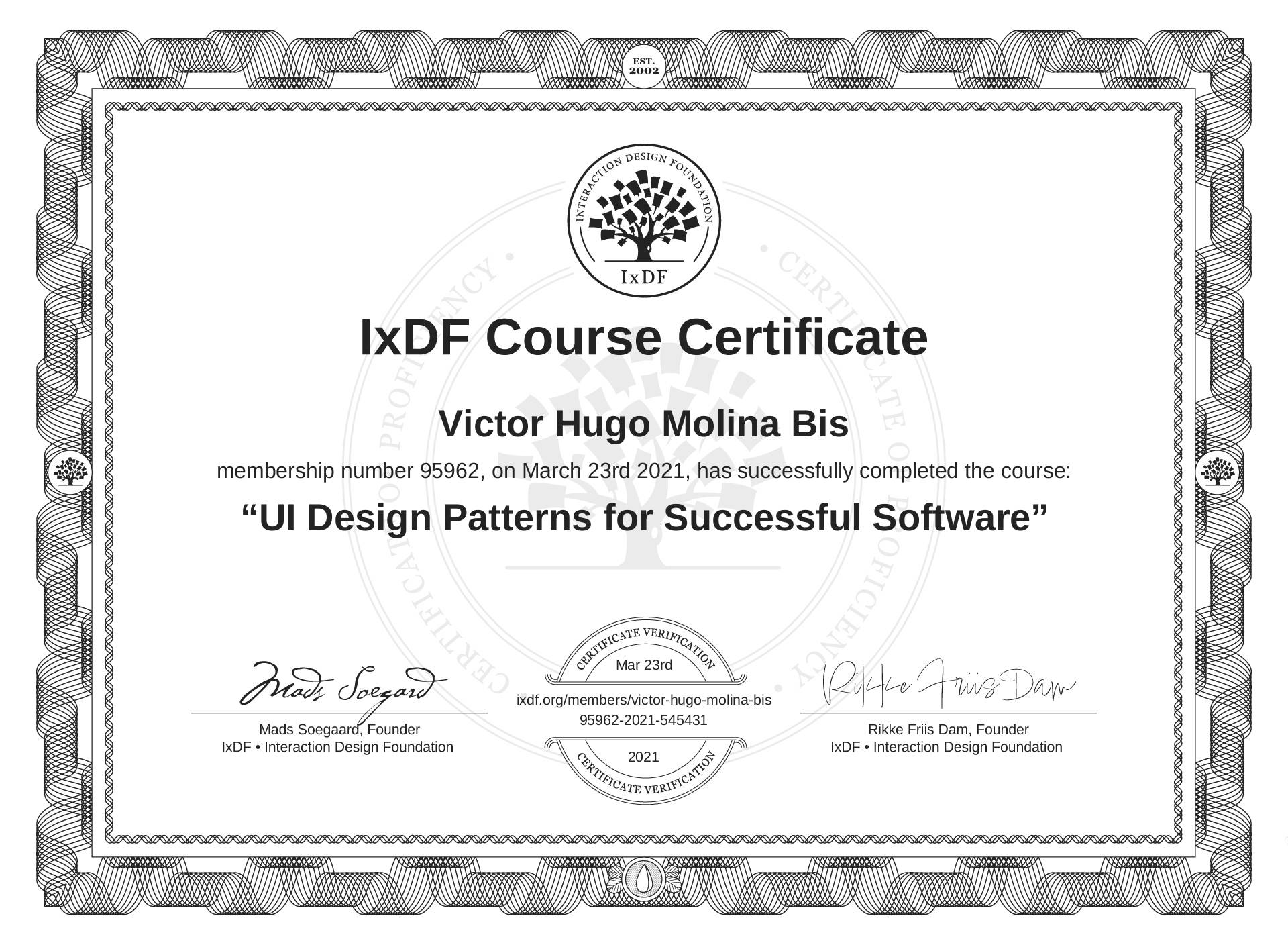 Victor Hugo Molina Bis's IxDF Course Certificate: UI Design Patterns for Successful Software