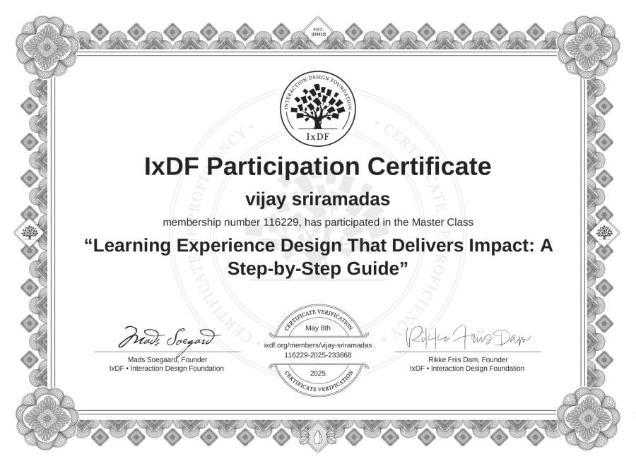 vijay sriramadas's IxDF Masterclass Certificate: Learning Experience Design That Delivers Impact: A Step-by-Step Guide