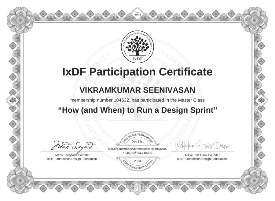 VIKRAMKUMAR SEENIVASAN's IxDF Masterclass Certificate: How (and When) to Run a Design Sprint