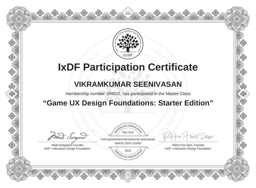 VIKRAMKUMAR SEENIVASAN's IxDF Masterclass Certificate: Game UX Design Foundations: Starter Edition