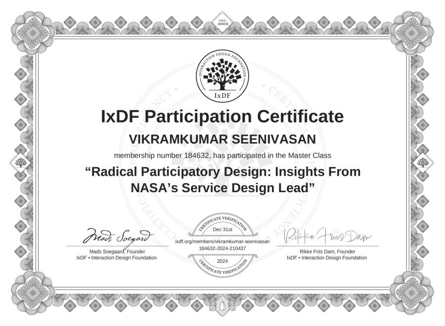 VIKRAMKUMAR SEENIVASAN's IxDF Masterclass Certificate: Radical Participatory Design: Insights From NASA’s Service Design Lead