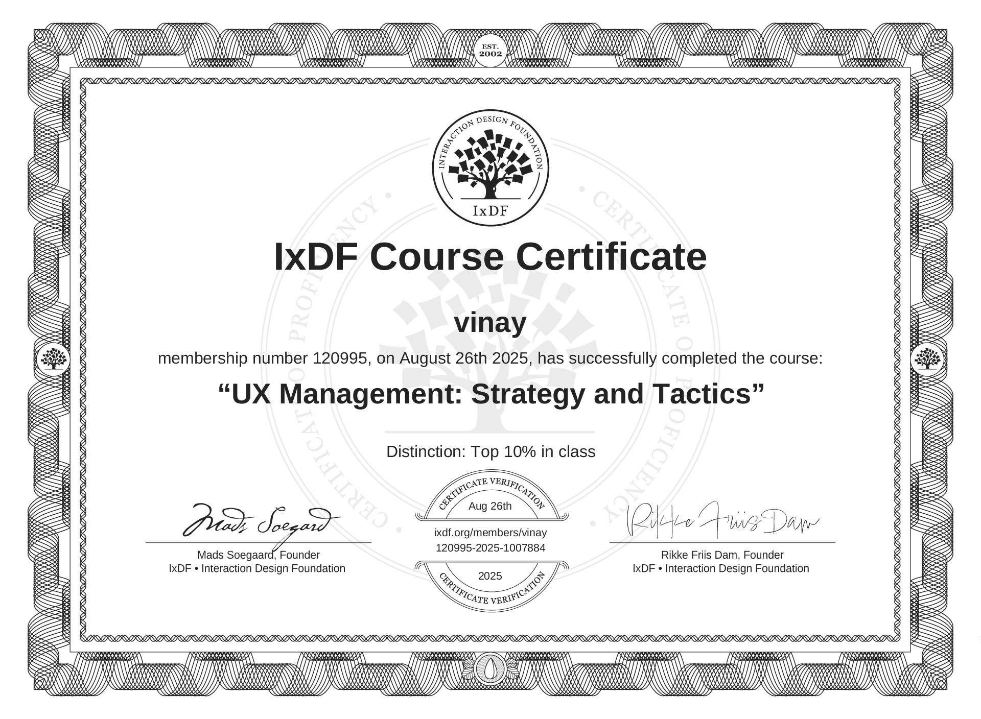 The IxDF Course Certificate above is awarded to vinay with a Top 10% Distinction in formal recognition of their coursework surpassing the rigorous benchmarks of exceptional performance established by the IxDF Educational Codex.