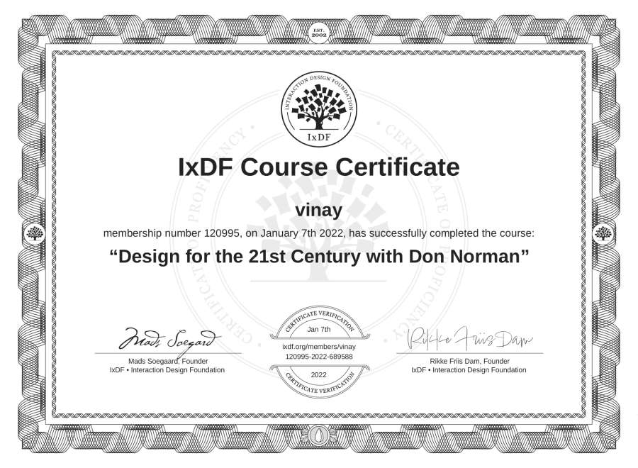vinay's IxDF Course Certificate: Design for the 21st Century with Don Norman