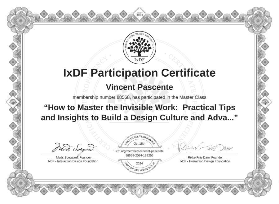 Vincent Pascente's IxDF Masterclass Certificate: How to Master the Invisible Work: Practical Tips and Insights to Build a Design Culture and Advance Your Career