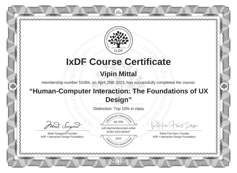 The IxDF Course Certificate above is awarded to Vipin Mittal with a Top 10% Distinction in formal recognition of their coursework surpassing the rigorous benchmarks of exceptional performance established by the IxDF Educational Codex.