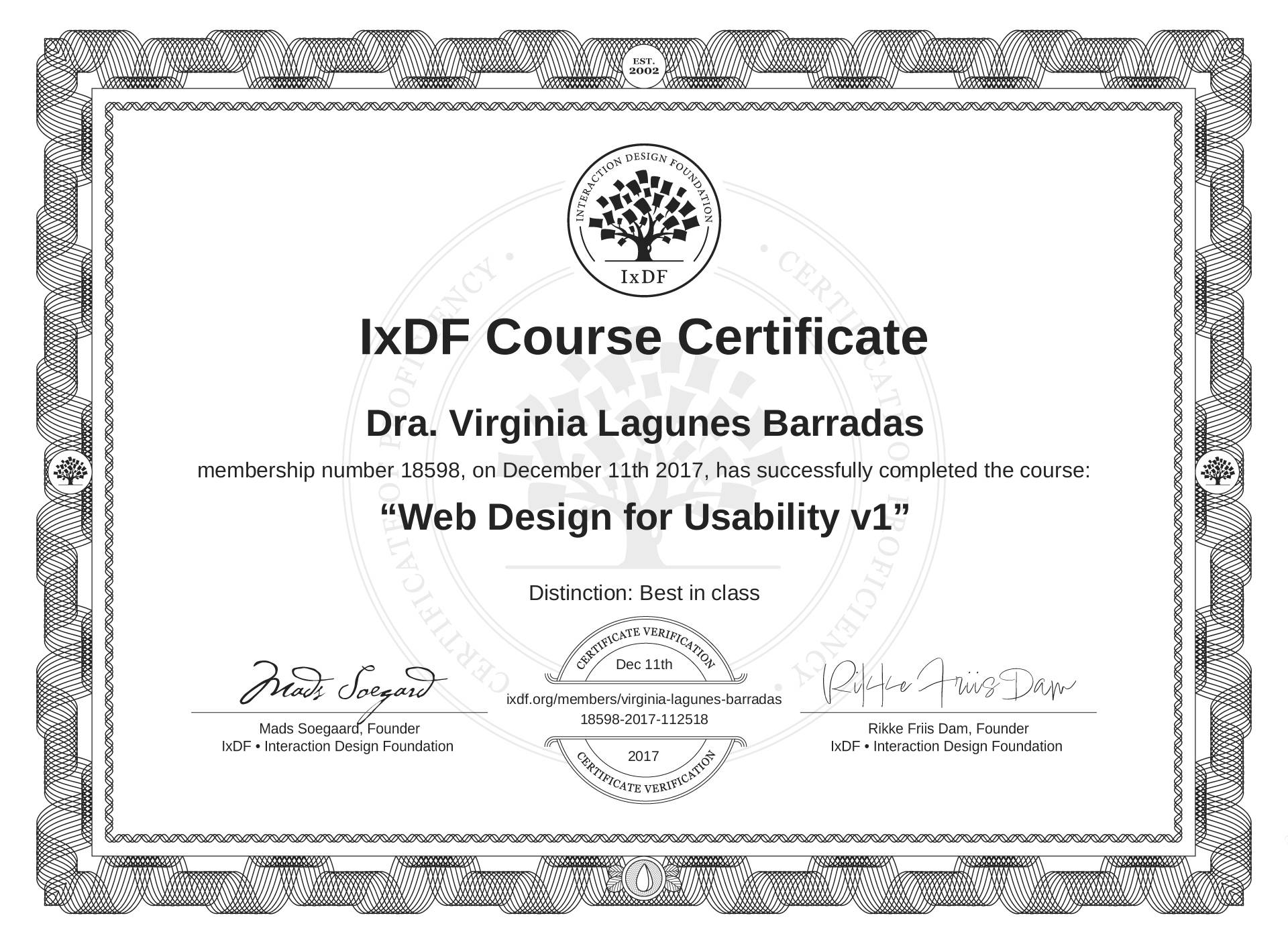 The IxDF Course Certificate above is awarded to Dra. Virginia Lagunes Barradas with a Best in Class Distinction in formal recognition of their coursework surpassing the rigorous benchmarks of exceptional performance established by the IxDF Educational Codex.