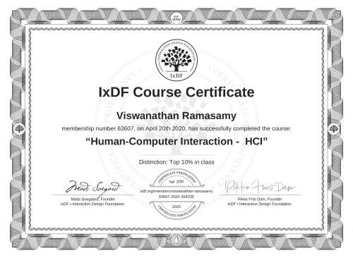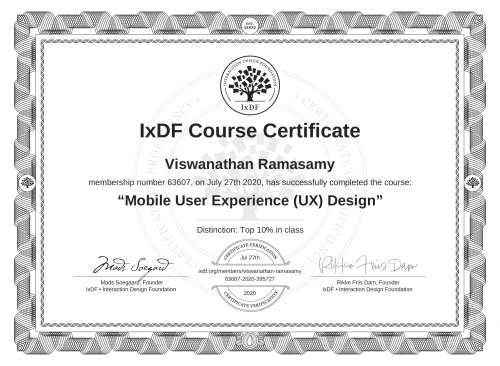 IxDF Course Certificates are awarded to Viswanathan Ramasamy in formal recognition of their coursework surpassing the rigorous benchmarks of exceptional performance established by the IxDF Educational Codex.