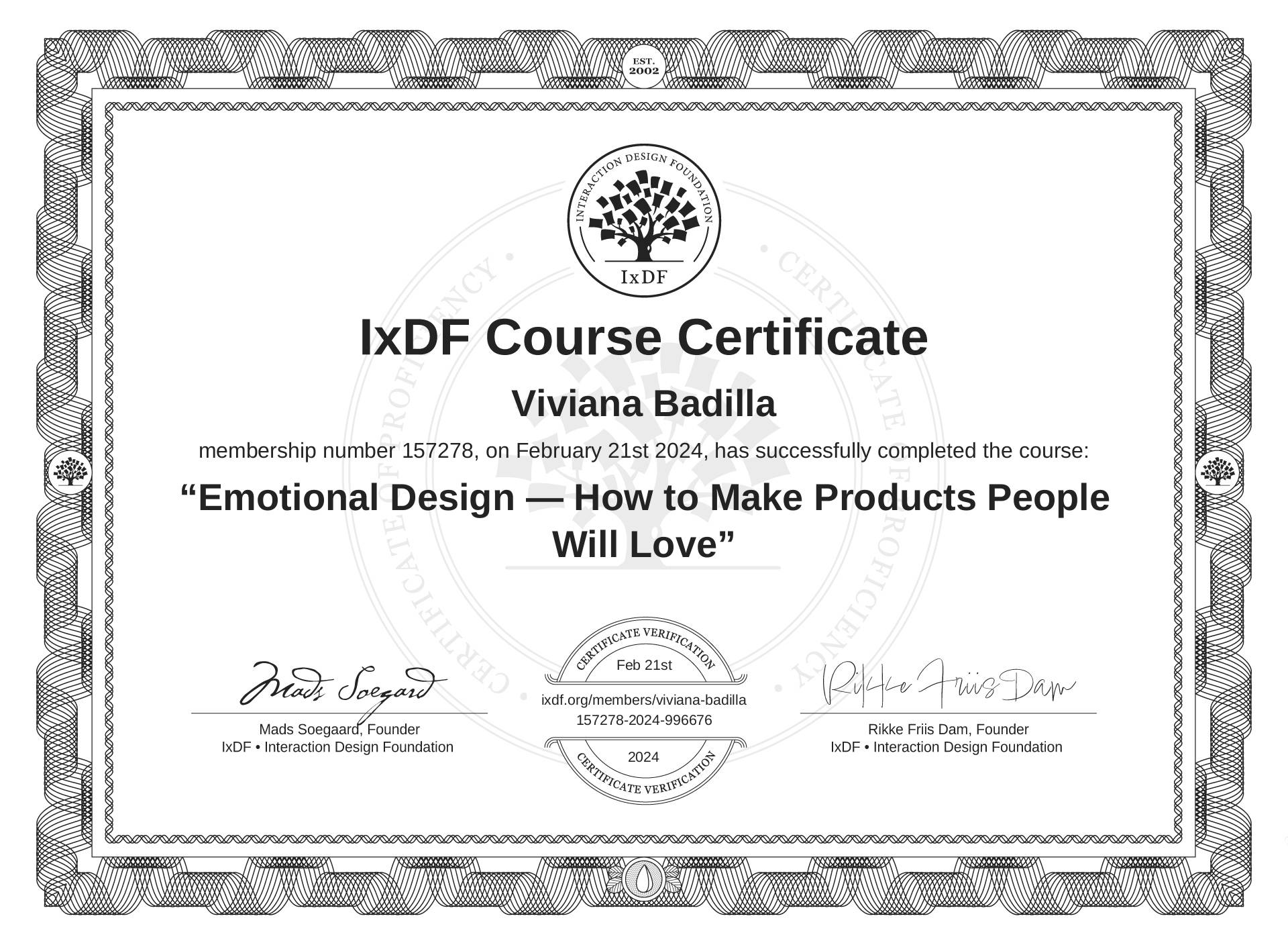 Viviana Badilla's IxDF Course Certificate: Emotional Design — How to Make Products People Will Love