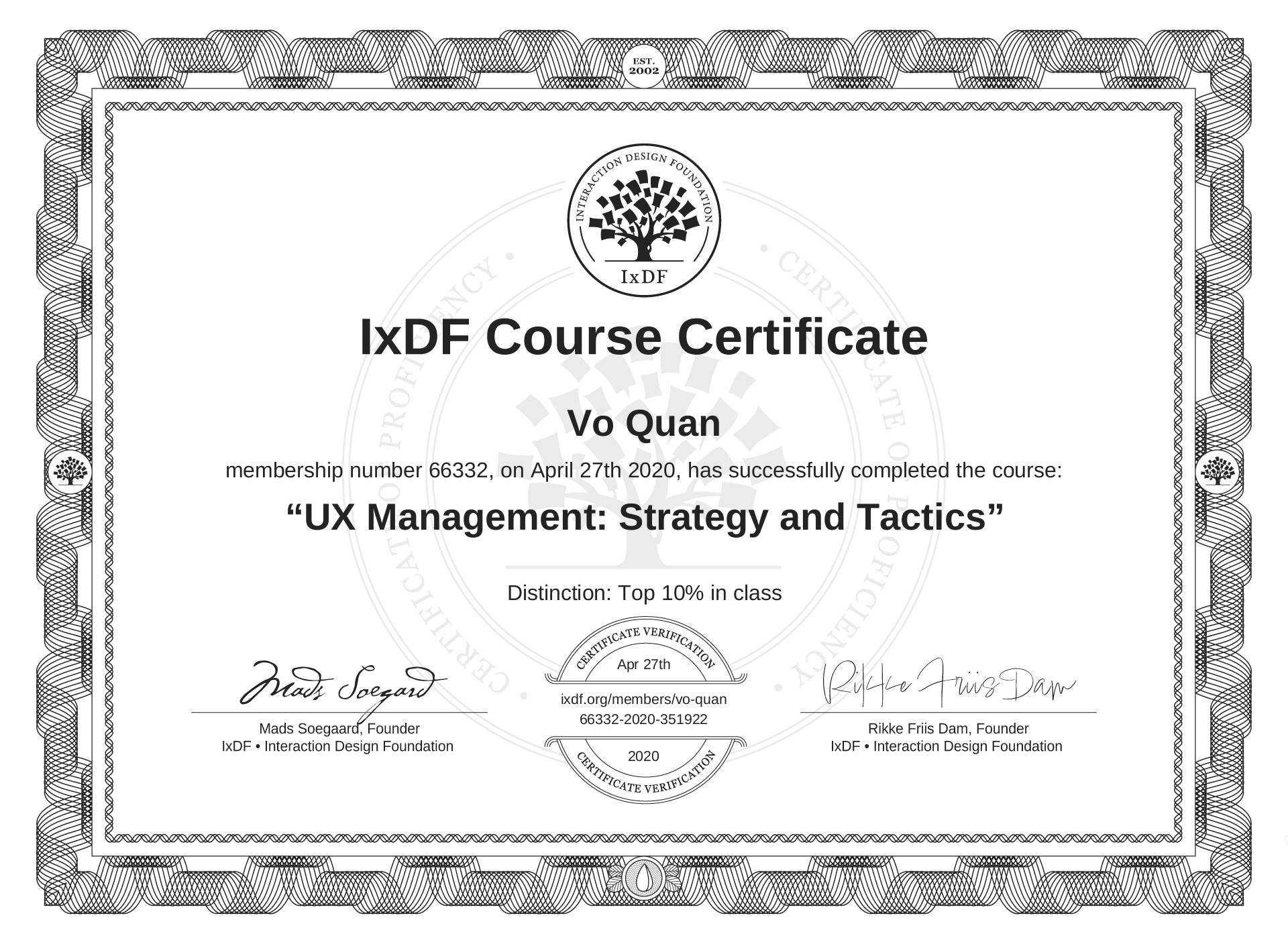 The IxDF Course Certificate above is awarded to Vo Quan with a Top 10% Distinction in formal recognition of their coursework surpassing the rigorous benchmarks of exceptional performance established by the IxDF Educational Codex.