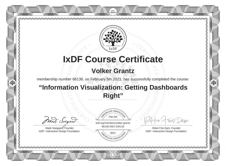 Volker Grantz's IxDF Course Certificate: Information Visualization: Getting Dashboards Right
