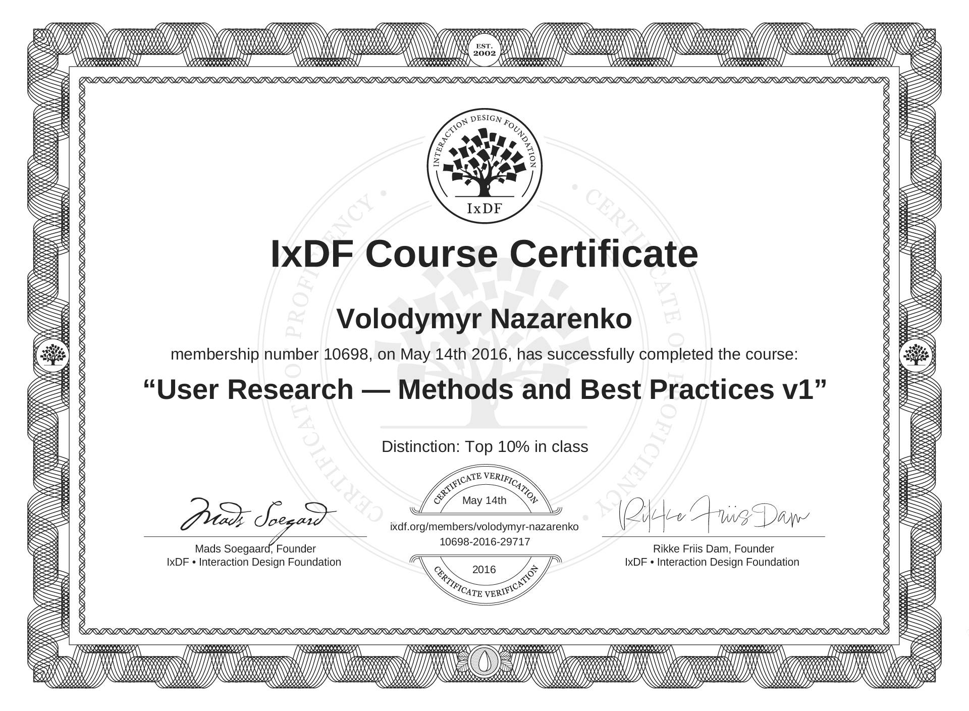 Volodymyr Nazarenko's IxDF Course Certificate: User Research — Methods and Best Practices v1