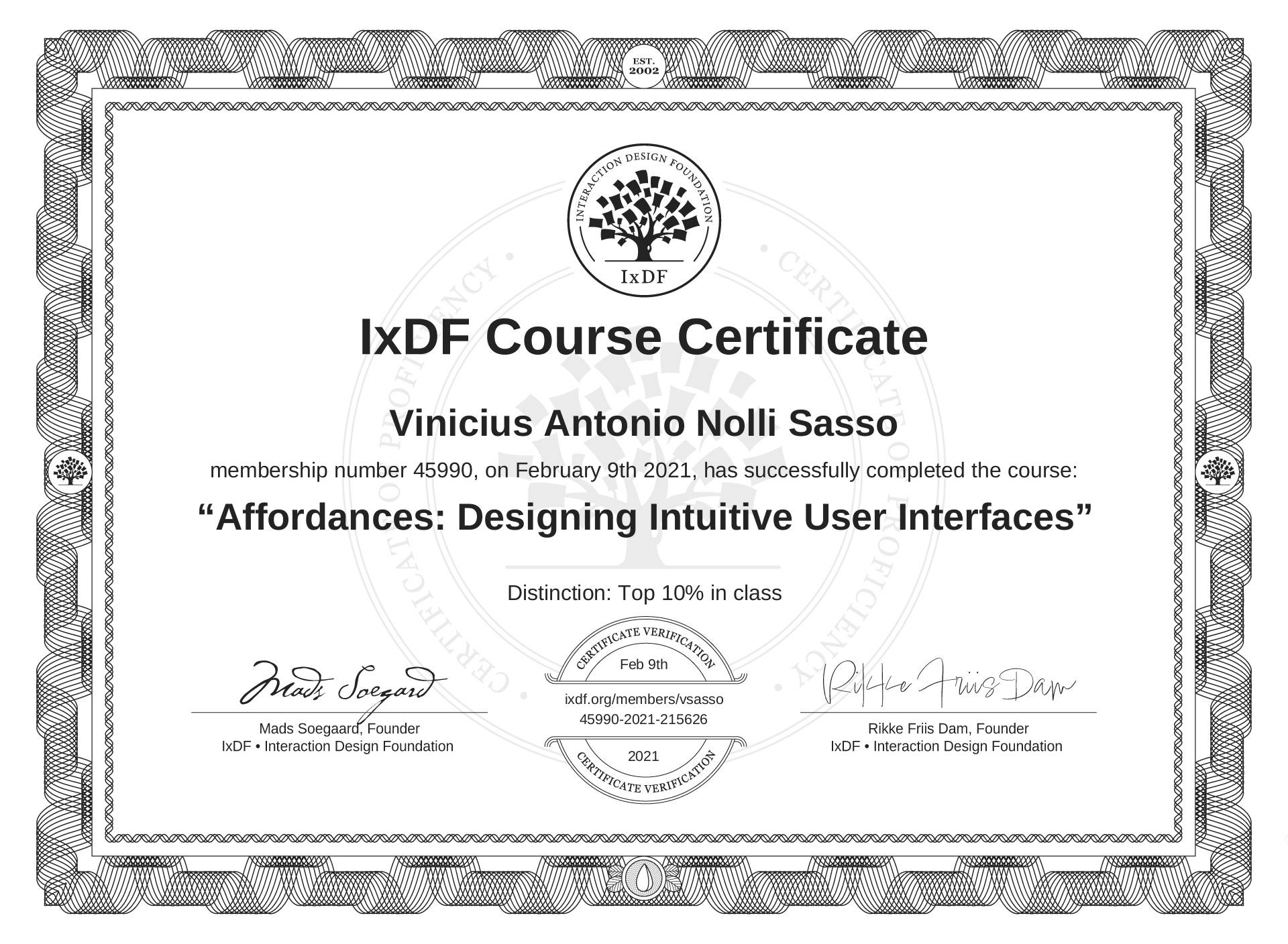 The IxDF Course Certificate above is awarded to Vinicius Antonio Nolli Sasso with a Top 10% Distinction in formal recognition of their coursework surpassing the rigorous benchmarks of exceptional performance established by the IxDF Educational Codex.
