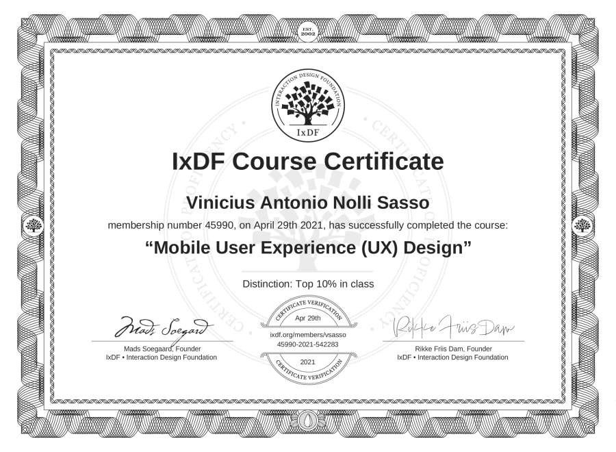 Vinicius Antonio Nolli Sasso's IxDF Course Certificate: Mobile User Experience (UX) Design