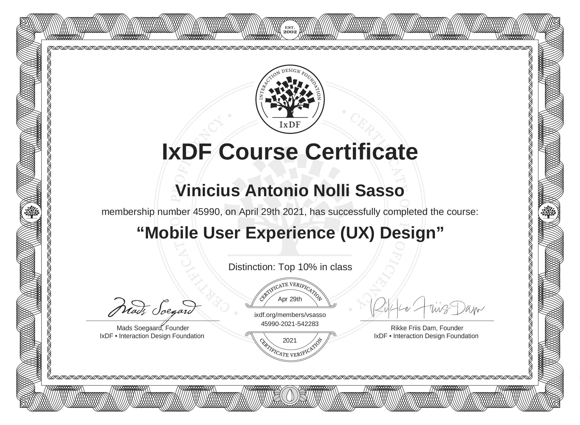 The IxDF Course Certificate above is awarded to Vinicius Antonio Nolli Sasso with a Top 10% Distinction in formal recognition of their coursework surpassing the rigorous benchmarks of exceptional performance established by the IxDF Educational Codex.