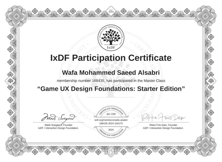 Wafa Mohammed Saeed Alsabri's IxDF Masterclass Certificate: Game UX Design Foundations: Starter Edition