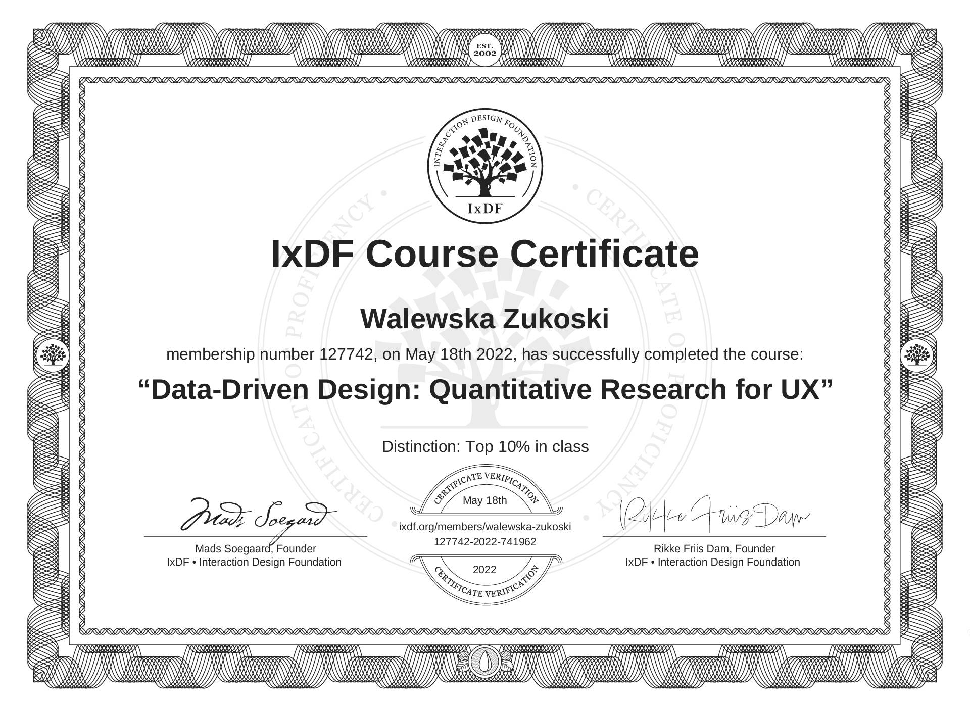 The IxDF Course Certificate above is awarded to Walewska Zukoski with a Top 10% Distinction in formal recognition of their coursework surpassing the rigorous benchmarks of exceptional performance established by the IxDF Educational Codex.