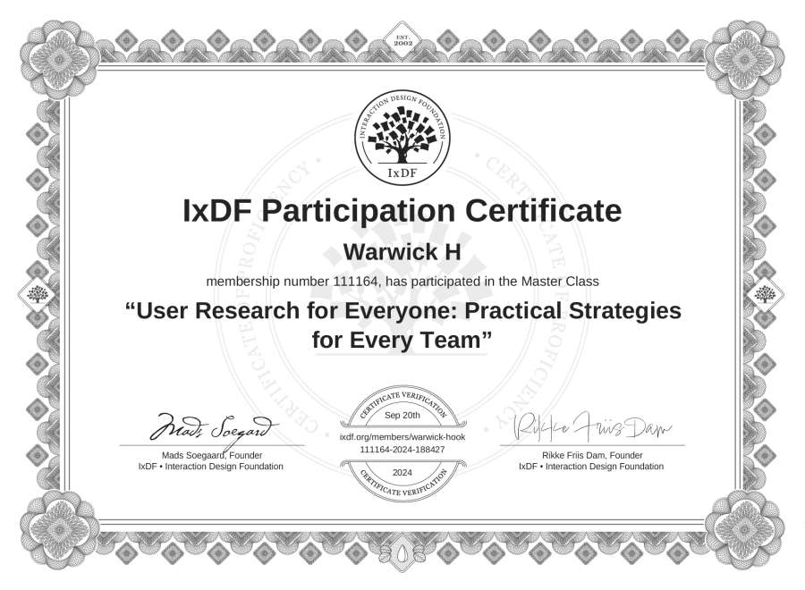 Warwick H's IxDF Masterclass Certificate: User Research for Everyone: Practical Strategies for Every Team