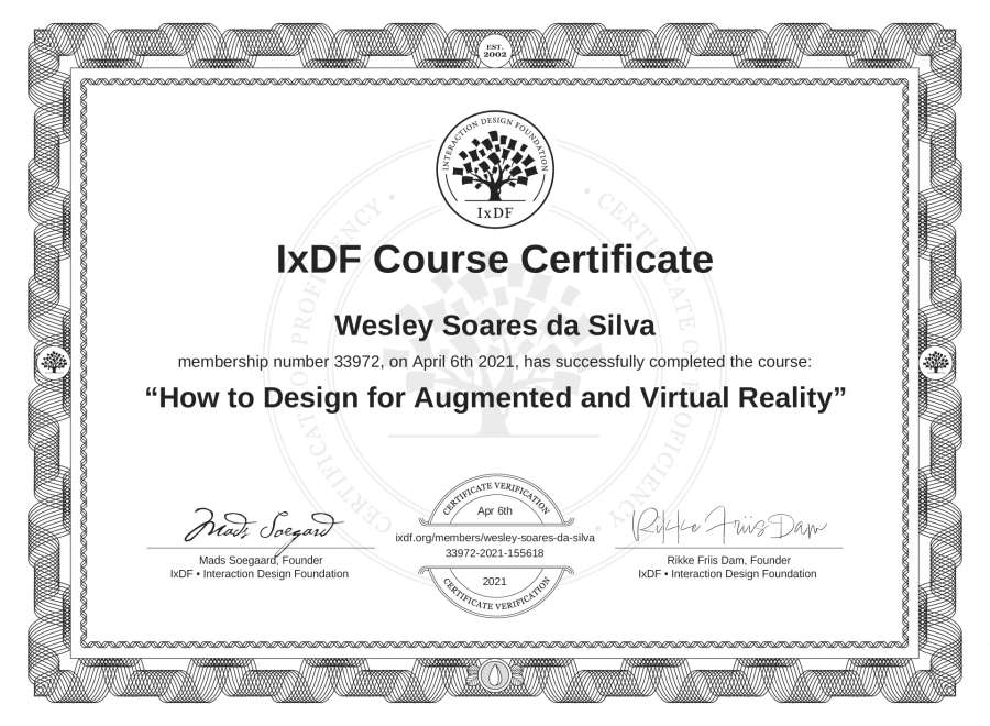 Wesley Soares da Silva's IxDF Course Certificate: How to Design for Augmented and Virtual Reality