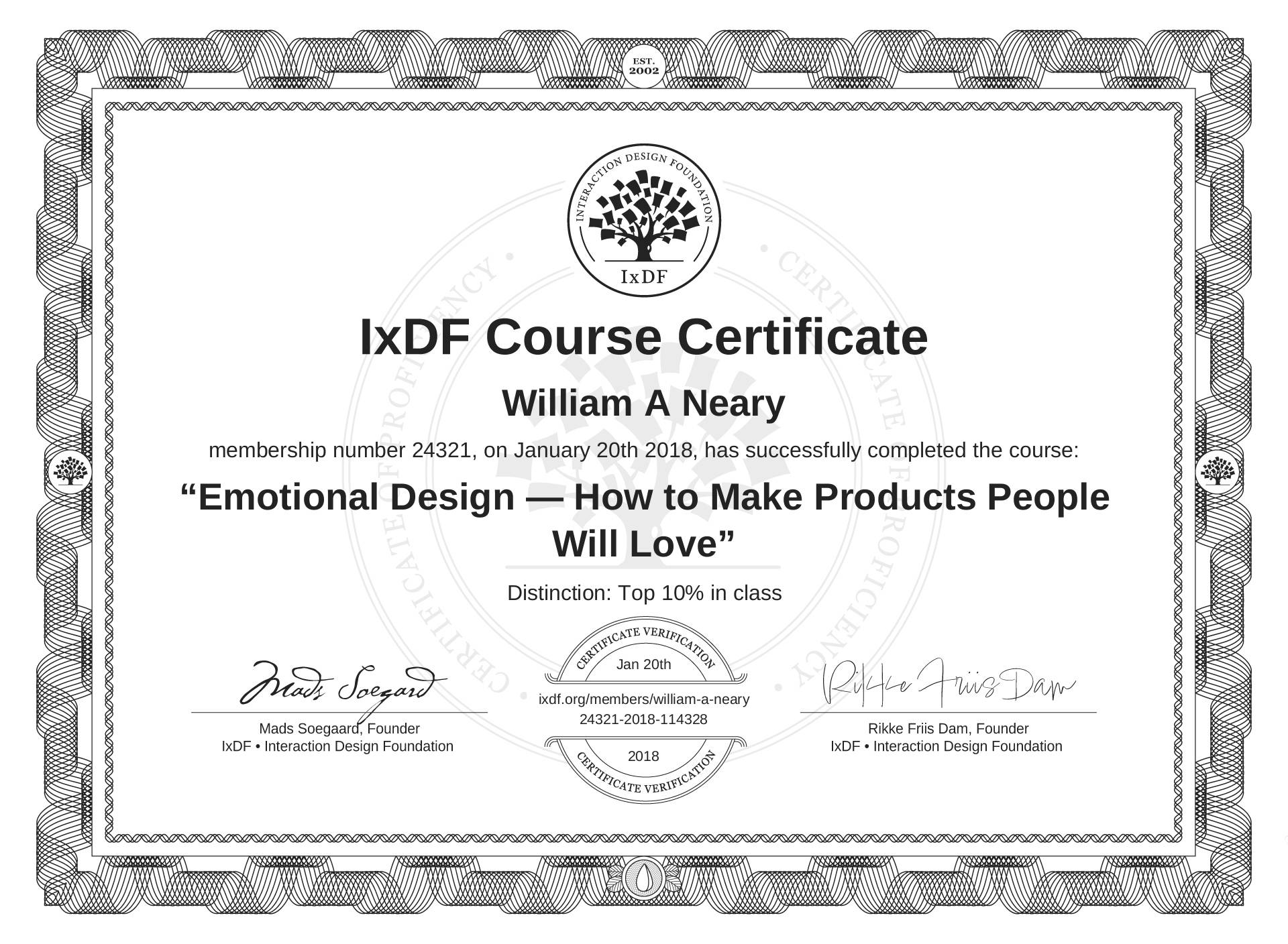 William A Neary's IxDF Course Certificate: Emotional Design — How to Make Products People Will Love