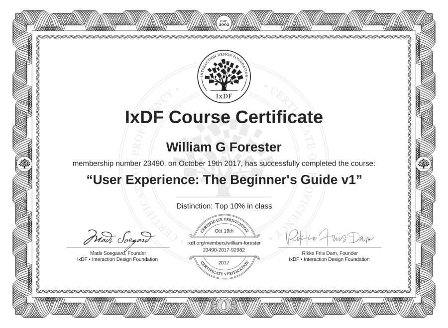 The IxDF Course Certificate above is awarded to William G Forester with a Top 10% Distinction in formal recognition of their coursework surpassing the rigorous benchmarks of exceptional performance established by the IxDF Educational Codex.