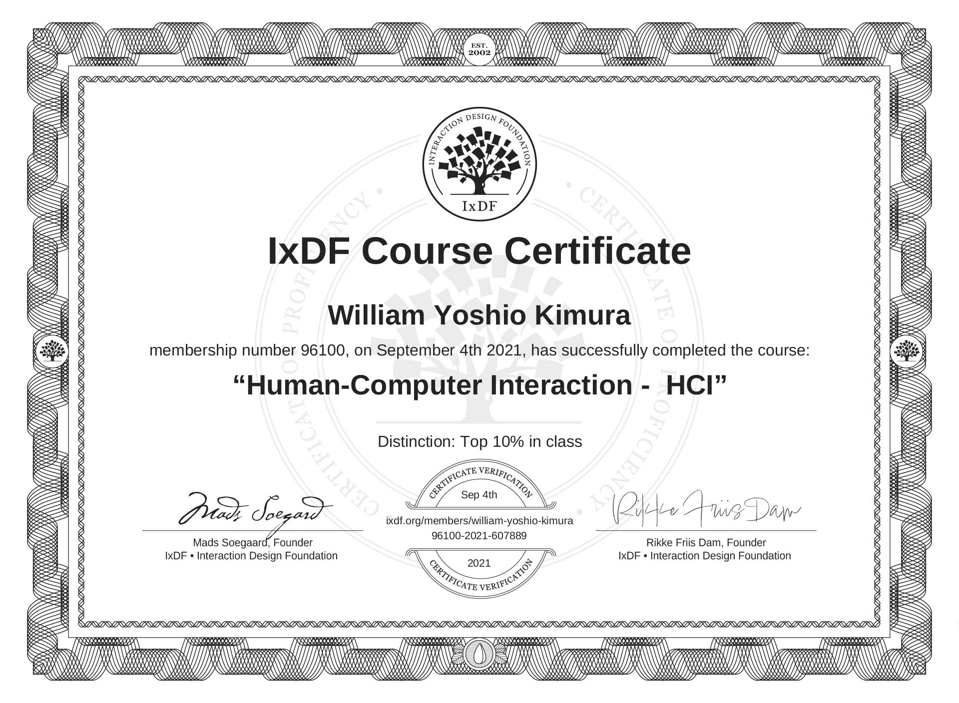 The IxDF Course Certificate above is awarded to William Yoshio Kimura with a Top 10% Distinction in formal recognition of their coursework surpassing the rigorous benchmarks of exceptional performance established by the IxDF Educational Codex.