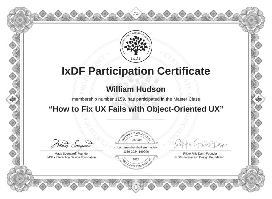 William Hudson's IxDF Masterclass Certificate: How to Fix UX Fails with Object-Oriented UX