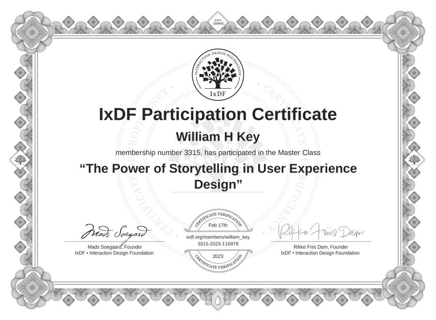 William H Key's IxDF Masterclass Certificate: The Power of Storytelling in User Experience Design
