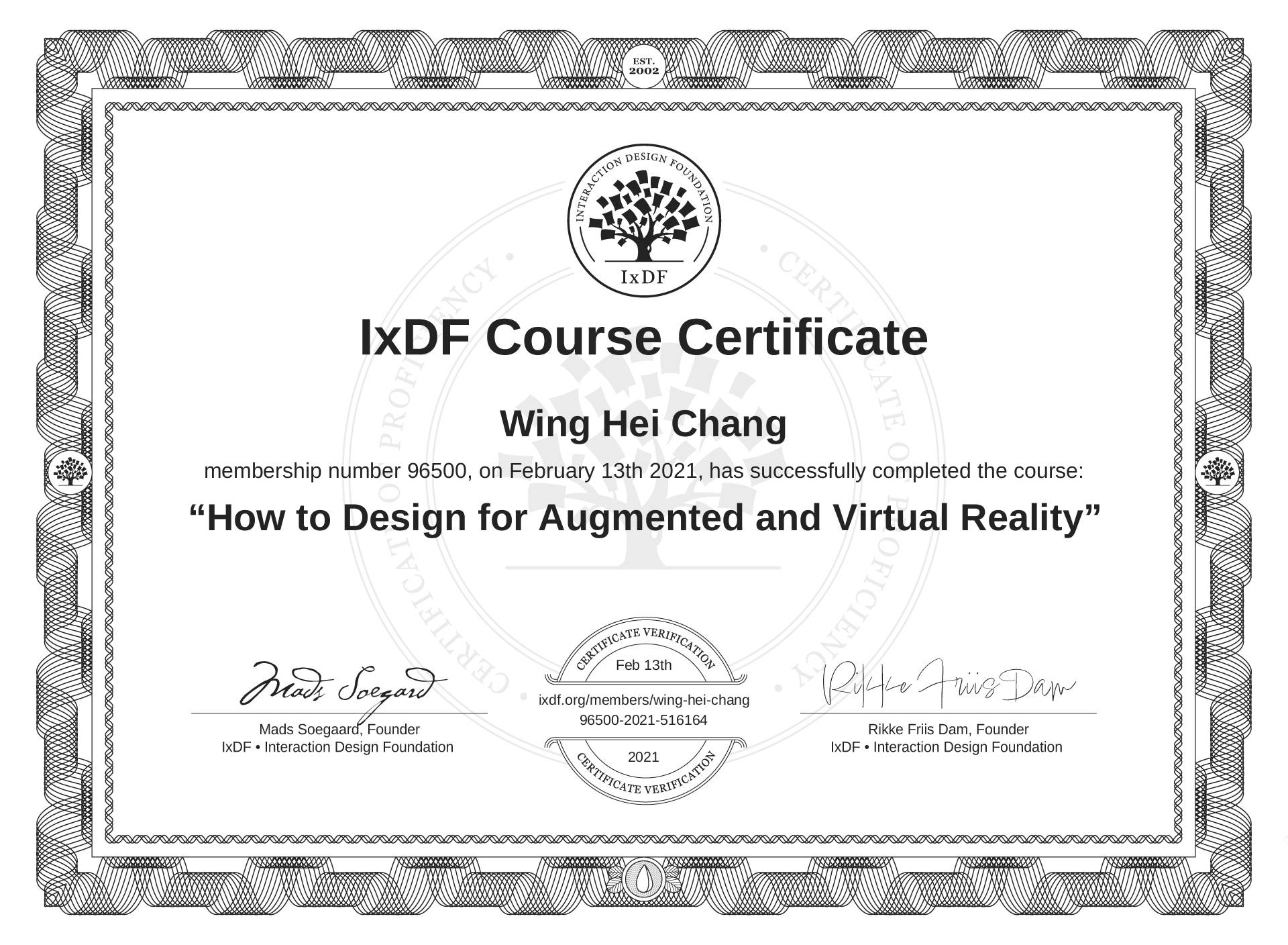 Wing Hei Chang's IxDF Course Certificate: How to Design for Augmented and Virtual Reality