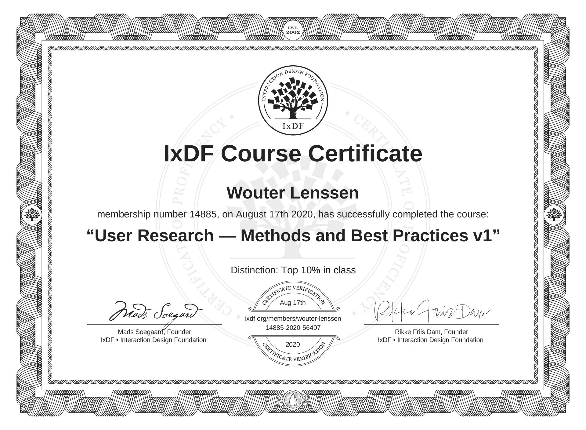The IxDF Course Certificate above is awarded to Wouter Lenssen with a Top 10% Distinction in formal recognition of their coursework surpassing the rigorous benchmarks of exceptional performance established by the IxDF Educational Codex.