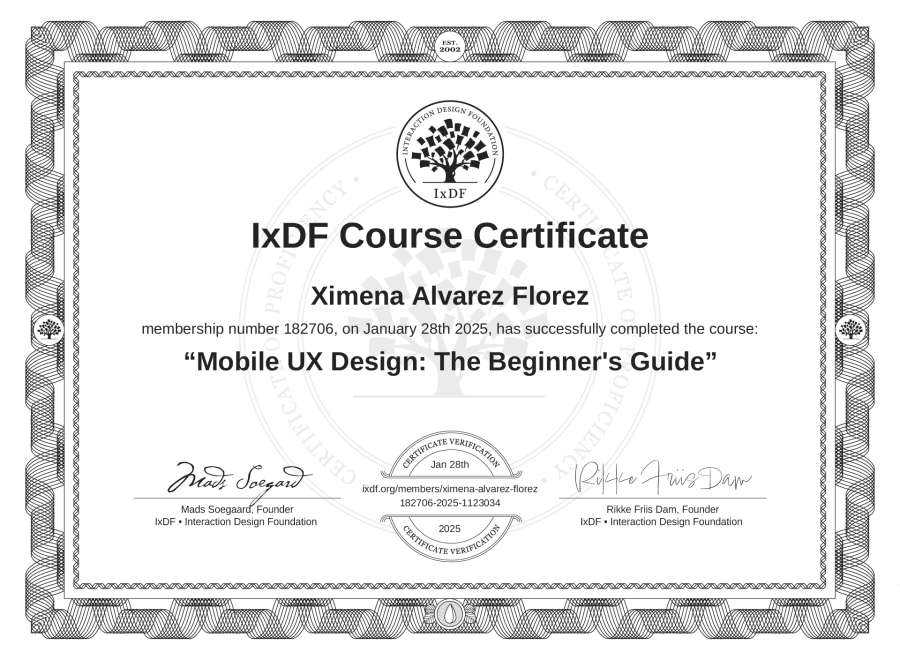 Ximena Álvarez Flórez's IxDF Course Certificate: Mobile UX Design: The Beginner's Guide