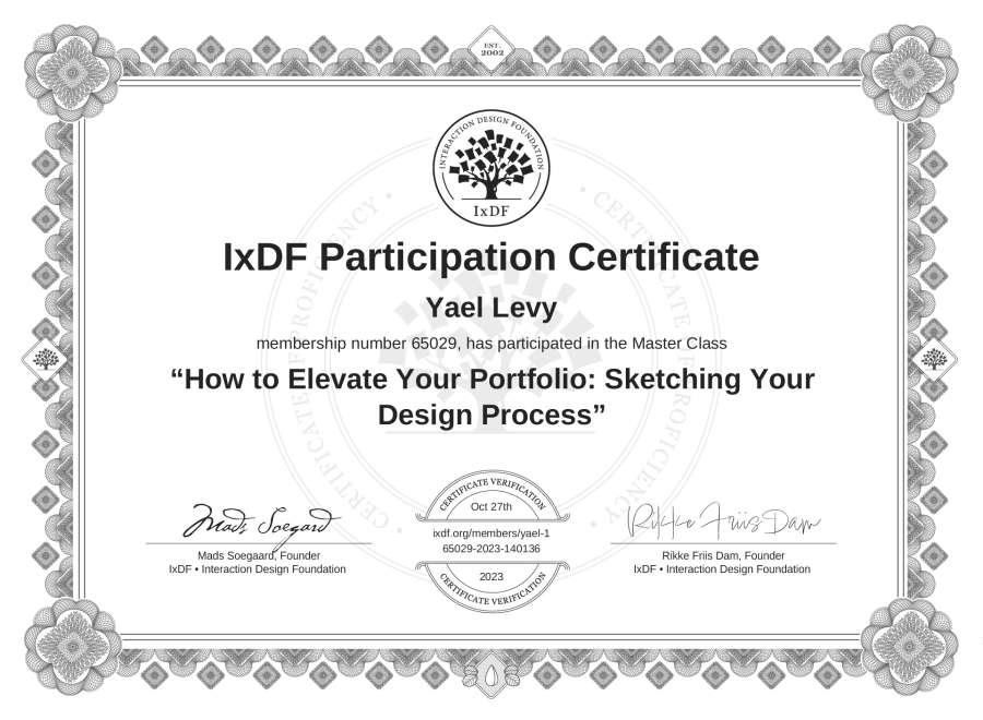 Yael Levy's IxDF Masterclass Certificate: How to Elevate Your Portfolio: Sketching Your Design Process