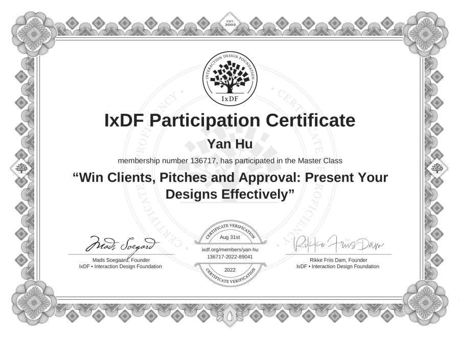 Yan Hu's IxDF Masterclass Certificate: Win Clients, Pitches and Approval: Present Your Designs Effectively